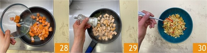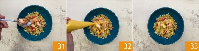 Fügen Sie die in der Pfanne gebratenen Lachswürfel hinzu 31, würzen Sie mit der hausgemachten Mayonnaise und beenden Sie mit den schwarzen Sesamsamen 33. Ihr Basmati-Reis mit Lachs, Sesam und scharfer Sauce ist servierfertig!