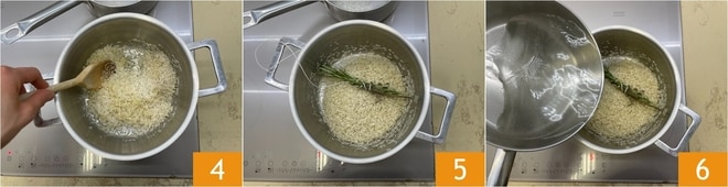 Rösten Sie den Reis unter häufigem Rühren 4 und wenn er sehr heiß ist, fügen Sie Thymian und Rosmarin hinzu, die mit einem Faden zusammengebunden sind 5. Gießen Sie das kochende Wasser hinzu 6, decken Sie den Topf ab und reduzieren Sie die Hitze. Kochen Sie den Reis gemäß der auf der Packung angegebenen Zeit, etwa 10 Minuten.