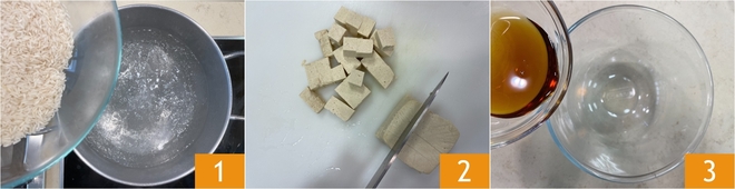 Um den Basmati-Reis mit Tofu in Sojasauce und gebratenem Gemüse zuzubereiten, geben Sie zuerst den Reis in reichlich gesalzenes Wasser 1 und kochen ihn für die auf der Verpackung angegebene Zeit. In der Zwischenzeit kümmern Sie sich um die anderen Zutaten: Schneiden Sie den Tofu in Würfel und geben Sie dann den Ahornsirup in eine Schüssel 3.
