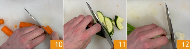 Schälen und putzen Sie die Karotten, halbieren Sie sie längs und schneiden Sie sie in Rauten von etwa 3–4 mm Dicke 10. Machen Sie dasselbe mit den Zucchini 11. Schneiden Sie zum Schluss die Frühlingszwiebel in Scheiben 12.