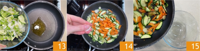 Erhitzen Sie in einer beschichteten Pfanne etwas Öl, geben Sie das Gemüse dazu 13 und braten es bei starker Hitze für ein paar Minuten an, dabei leicht salzen 14. Wenn es gebräunt, aber noch knackig ist, stellen Sie es beiseite 15.