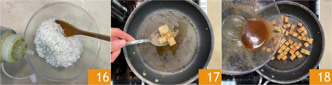 Inzwischen sollte der Reis gar sein; gießen Sie ihn in eine Schüssel ab und würzen Sie ihn mit etwas Öl 16. Nehmen Sie den Tofu aus der Marinade und geben Sie ihn in dieselbe Pfanne, in der Sie das Gemüse gebraten haben 17, und braten ihn dann ein Paar Minuten bei hoher Hitze, bis er gut gebräunt ist. Geben Sie nun auch die Marinade 18 und einen Schuss Wasser dazu, rühren Sie gut um und schalten die Hitze aus.