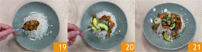 Sie sind bereit zum Anrichten: Legen Sie den Reis als Basis auf den Teller, geben Sie dann den Tofu mit seiner Sauce 19 und das Gemüse 20 darauf. Vollenden Sie das Gericht mit schwarzen und weißen Sesamsamen und gehacktem Schnittlauch. Ihr Basmati-Reis mit Tofu in Sojasauce und gebratenem Gemüse ist bereit zum Genießen 21!