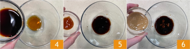 Fügen Sie die Sojasauce 4, die Sriracha-Sauce 5 und die Erdnussbutter 6 hinzu.