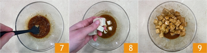 Vermischen Sie die Mischung gut 7, dann geben Sie die Tofuwürfel hinzu 8 und mischen sie mit den Händen, damit sie gleichmäßig gewürzt werden 9. Lassen Sie sie marinieren, während Sie mit dem Rest des Rezepts fortfahren.