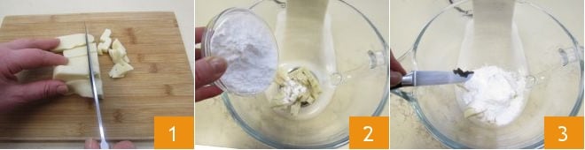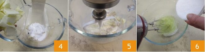 Fügt auch die weiche, in Würfel geschnittene Butter hinzu 4 und verarbeitet alles mit dem Flachrührer 5 bei mittlerer Geschwindigkeit für einige Minuten. In der Zwischenzeit beginnt ihr, das Eiweiß zu schlagen, indem ihr nach und nach den Zucker hinzufügt 6,