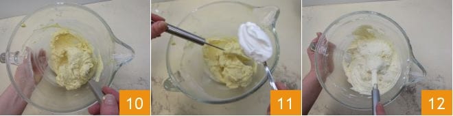 Mit einem Spatel umrühren, um sicherzustellen, dass alle Zutaten perfekt vermischt sind 10 und beginnen, das Eiweiß nach und nach hinzuzufügen 11, von unten nach oben rühren, um die Masse nicht zusammenfallen zu lassen 12.