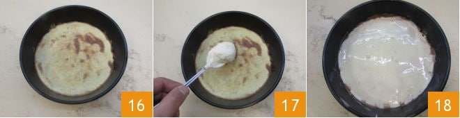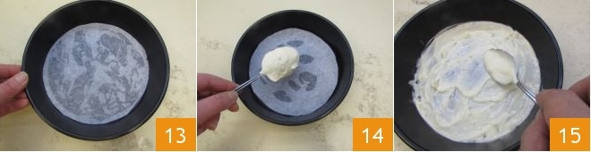 Die 20 cm große Kuchenform nehmen und den Boden, der zuvor eingefettet wurde, mit einem Kreis Backpapier auslegen 13. An diesem Punkt zwei Esslöffel Teig nehmen 14 und sie so verteilen, dass die gesamte Oberfläche bedeckt ist 15.