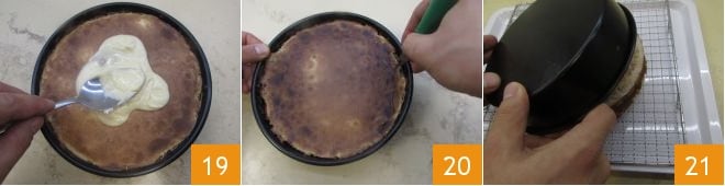 Wenn ihr die letzte Schicht erreicht habt 19, den Ofen auf 180° (im statischen Modus) senken und nach dem guten Verteilen der letzten Teigschicht für 20 Minuten backen. Sobald der Backvorgang abgeschlossen ist, den Kuchen aus dem Ofen nehmen und abkühlen lassen. Mit einem kleinen Messer die Ränder des Kuchens vorsichtig lösen 20 und auf ein Gitter stürzen 21.