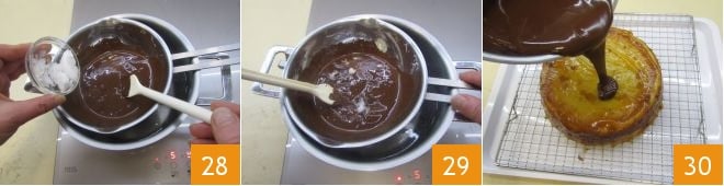 Sobald sie vollständig geschmolzen ist, das Kokosöl hinzufügen 28 und es vollständig schmelzen lassen 29. Den Behälter aus dem heißen Wasser nehmen und die Schokolade gelegentlich rühren, bis sie abgekühlt ist, dann über den Kuchen gießen 30