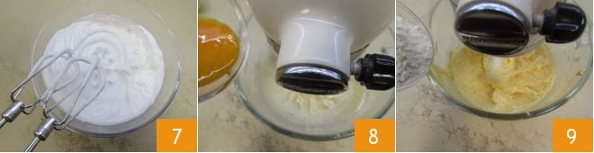bis ihr eine weiße und feste Masse erhaltet 7. An diesem Punkt das Eigelb nach und nach in die Küchenmaschine geben 8 und wenn es vollständig aufgenommen wurde, auch das Mehl 9 hinzufügen, noch 1-2 Minuten warten und die Maschine ausschalten.