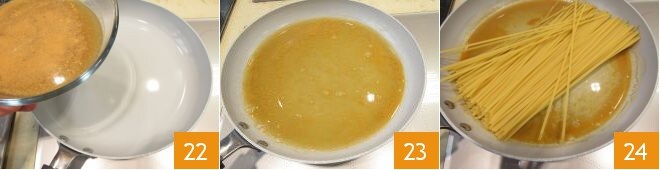 Inzwischen erhitzen Sie in einem großen Topf einen Teil der Bisque (22-23), fügen Sie die Bavette hinzu 24 (sie sollten bequem liegen und Sie sollten sie leicht umrühren können).