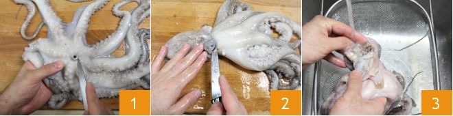 Um die Bavette mit Oktopus und Garnelen zuzubereiten, kochen Sie zuerst den Oktopus. Bringen Sie in einem großen Topf reichlich gesalzenes Wasser zum Kochen. Währenddessen Wie man Oktopus reinigt und kocht, indem Sie den Kopf umdrehen und leeren, den Zahn, der sich in der Mitte der Tentakel befindet, mit einem kleinen Messer entfernen 1 und die Augen herausnehmen 2; spülen Sie ihn sehr gut unter kaltem, fließendem Wasser ab 3.