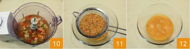 Kochen Sie auf niedriger Hitze, bis die Flüssigkeit auf die Hälfte reduziert ist, dann pürieren Sie alles 10 und filtern Sie es durch ein feinmaschiges Sieb 11. Sie haben Ihren Krabbenfond 12 erhalten.