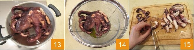 Sobald der Oktopus gekocht ist, lassen Sie ihn in seinem Kochwasser abkühlen, dann seihen Sie ihn ab (13-14) und schneiden Sie ihn in Stücke 15.