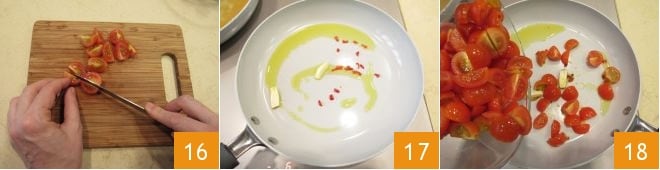 Schneiden Sie dann auch die Kirschtomaten in 4 16. In einer Pfanne braten Sie den Knoblauch und die entkernten und in Streifen geschnittenen Chilischoten mit dem Olivenöl extra vergine an 17, dann fügen Sie die Kirschtomaten und das Salz hinzu 18;