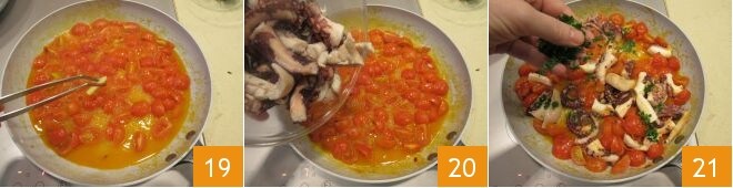 lassen Sie sie etwa 10 Minuten kochen, schalten Sie dann die Hitze aus, entfernen Sie den Knoblauch 19, fügen Sie den Oktopus 20 und die fein gehackte Petersilie 21 hinzu.