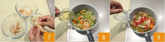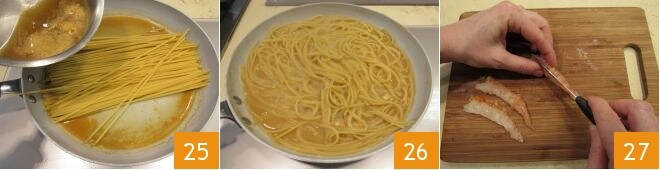 Bedecken Sie sie knapp mit der heißen Bisque 25. Rühren Sie ständig um, damit sie nicht kleben bleiben, fügen Sie nach und nach die heiße Bisque hinzu, bis sie 3 Minuten vor der Garzeit sind 26 (wenn Ihnen die Bisque vor dem Ende der Garzeit der Pasta ausgeht, können Sie heißes Wasser oder leichte Gemüsebrühe verwenden). In der Zwischenzeit schneiden Sie die Garnelen der Länge nach in zwei Hälften 27 (wenn sie kleiner sind, können Sie sie auch ganz lassen).