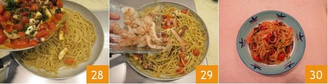 Sobald Ihre Bavette fast gekocht sind, fügen Sie die Tomatensauce und den Oktopus 28, die Garnelen 29 (wenn sie kleiner sind, können Sie sie auch ganz lassen), die gehackte Petersilie und den gemahlenen Pfeffer hinzu. Beenden Sie das Kochen und servieren Sie Ihre Bavette mit Oktopus und Garnelen heiß 30.