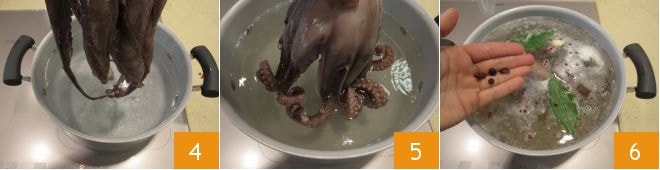 Sobald das Wasser kocht, tauchen Sie die Tentakel mehrmals ein und aus, bis sie sich kräuseln (4-5) (sie werden viel schöner aussehen, wenn sie angerichtet werden) und tauchen Sie dann den gesamten Oktopus vollständig ein. Fügen Sie dem Wasser auch die Aromen hinzu: das Lorbeerblatt, die Wacholderbeeren, die leicht zerdrückte Knoblauchzehe und die rosa Pfefferkörner 6. Decken Sie den Topf mit einem Deckel ab, reduzieren Sie die Hitze auf ein Minimum (das Wasser sollte nur leicht sieden) und lassen Sie ihn 40 Minuten lang so kochen.