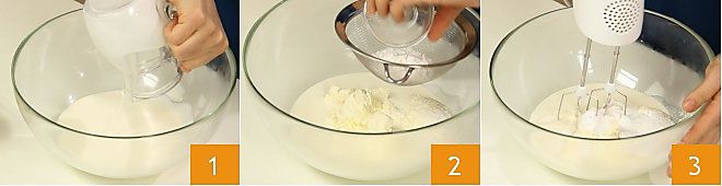 Um die Becher mit Pandoro und Kaffee zuzubereiten, bereiten Sie zunächst die Mascarpone-Sahne-Creme zu: Geben Sie in eine gut gekühlte Schüssel die ebenfalls gut gekühlte Sahne 1, den Mascarpone und den gesiebten Puderzucker 2. Schlagen Sie alles mit einem elektrischen Rührgerät auf 3.