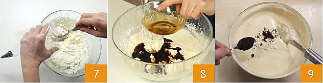 Holen Sie die Mascarpone-Creme hervor und bewahren Sie zwei Löffel davon für die abschließende Dekoration der Becher auf: Wir haben sie direkt in einen Spritzbeutel mit Sterntülle gegeben 7. Fügen Sie der restlichen Creme den abgekühlten Kaffee hinzu 8 und mischen Sie, um alles zu vereinigen. Geben Sie etwas Kaffeepulver zur Creme: Es reicht auch nur die Spitze eines Teelöffels, aber wenn Sie möchten, können Sie mehr hinzufügen 9. Die Creme sollte homogen und weich sein.