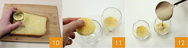 Schneiden Sie nun aus etwa 1 cm dicken Pandoro-Scheiben die Basis der Becher mit einem Ausstecher von etwa 5 cm Durchmesser 10 (Durchmesser und Höhe der Basis können je nach verwendetem Glas variieren, passen Sie sich entsprechend an). Sie können die Basis auch mit zerbröckeltem Pandoro zusammenstellen. Legen Sie den Pandoro auf den Boden Ihrer Gläser 11 und bedecken Sie ihn mit einem Löffel Kaffeecreme 12; Sie können auch mehrere Pandoro-Scheiben mit der Creme abwechseln.