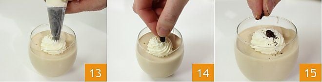 Zum Schluss drücken Sie in der Mitte der Becher einen Sahnetuff mit dem Spritzbeutel aus 13 und legen darauf eine Kaffeebohne 14. Bestäuben Sie die Becher mit einer Prise Kaffeepulver 15 et voilà: Ihre Becher mit Pandoro und Kaffee sind bereit zum Genießen!