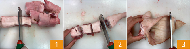 Um die überarbeitete Cassoeula mit Polenta zuzubereiten, schneiden Sie zuerst das Füßchen 1, das Schwänzchen 2 und das Ohr 3 in kleinere Stücke.