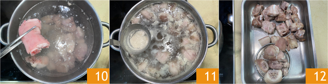 Tauchen Sie die anderen Schweineteile in kochendes Wasser 10 und kochen Sie sie etwa 20 Minuten lang, schäumen Sie gelegentlich den Schaum von der Oberfläche ab 11. Nach dieser Zeit alles abseihen und zu den Rippchen auf das Backblech geben 12. Warm halten.