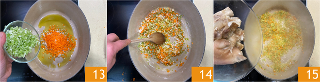 Erhitzen Sie reichlich Öl in einem großen Topf, geben Sie dann die fein gehackte Zwiebel, Karotte und den Sellerie hinzu 13 und lassen Sie es sanft anbraten 14. Wenn das Soffritto weich geworden ist, fügen Sie die Stücke von Schwarte und Füßchen hinzu 15.