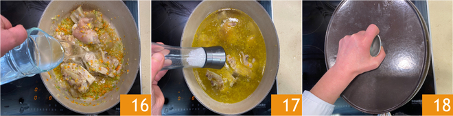 Mit kaltem Wasser bedecken 16, salzen 17 und pfeffern. Mit dem Deckel abdecken 18 und bei niedriger Flamme etwa 40 Minuten kochen lassen.