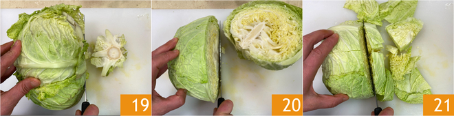 In der Zwischenzeit den Wirsing vorbereiten: das Ende entfernen 19, dann halbieren 20 und in grobe Stücke schneiden, auch die äußeren Blätter 21.
