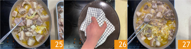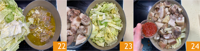 Nach den 40 Minuten Kochzeit den Wirsing in den Topf geben 22, dann die Stücke von Rüssel, Ohr und Schwänzchen hinzufügen 23. Auch die Tomatensauce hinzugeben 24 und weitere 15 Minuten mit Deckel weiterkochen.