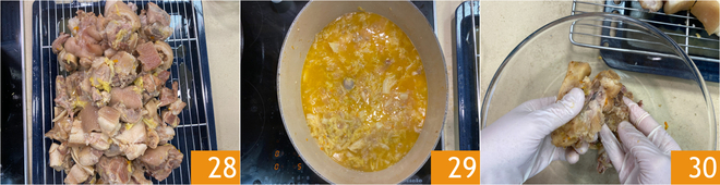 Die Fleischstücke auf ein Gitter legen, um überschüssige Flüssigkeit abtropfen zu lassen und abkühlen lassen 28. In der Zwischenzeit die Garflüssigkeit mit dem Wirsing bei niedriger Flamme etwa 30 Minuten reduzieren 29, bis eine dicke, glänzende und schmackhafte Sauce entsteht. Das Fleisch mit den Händen zerkleinern, um die Knochen zu entfernen, und es in einer Schüssel sammeln 30, zusammen mit den anderen Schweineteilen.
