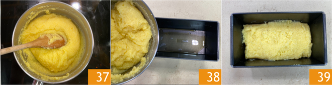 Wenn die Polenta eingedickt ist 37, in eine mit Öl gefettete Terrine von 20x10x7 cm umfüllen 38. Die Oberfläche glattstreichen 39 und mit Frischhaltefolie abdecken. Zuerst auf Raumtemperatur abkühlen lassen und dann im Kühlschrank, zusammen mit der Cassoeula-Terrine.