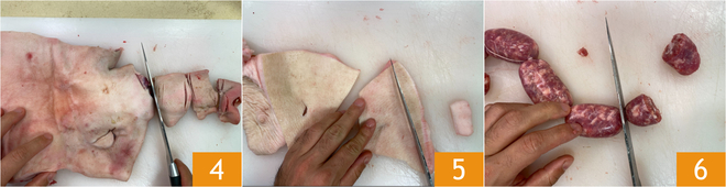 Machen Sie dasselbe mit dem Rüssel 4, der Schwarte 5 und den Verzini 6. Alternativ können Sie Ihren Metzger bitten, dies für Sie zu tun.