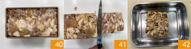 Nach der Abkühlzeit 40 die Cassoeula-Terrine auf ein Schneidebrett stürzen und in Scheiben von etwa 2-3 cm Dicke schneiden 41. Die Scheiben auf ein Backblech legen 42 und im Ofen bei 200°C 20 Minuten aufwärmen.