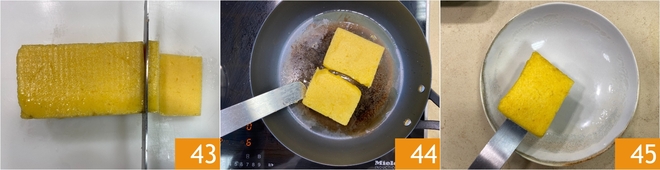 Auch die Polenta stürzen und in Scheiben schneiden 43, dann in einer Pfanne von beiden Seiten bis zur goldbraunen Farbe erhitzen 44. Jetzt zum Servieren: Eine Scheibe knusprige Polenta als Basis legen 45.