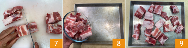 Schneiden Sie auch die Rippchen 7 in Stücke, verteilen Sie sie auf einem Backblech 8 und backen Sie sie im statischen Ofen bei 140°C etwa 20 Minuten lang 9.