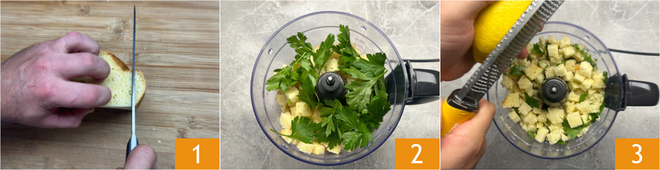 Um die gratinierten Riesengarnelen zuzubereiten, schneiden Sie zuerst die Kruste des Hartweizenbrotes 1 ab, um das Innere zu erhalten. Schneiden Sie es in Würfel und geben Sie es in einen Mixer, fügen Sie die Petersilie 2, die Zitronenschale 3 hinzu und mixen Sie für 1 Minute.