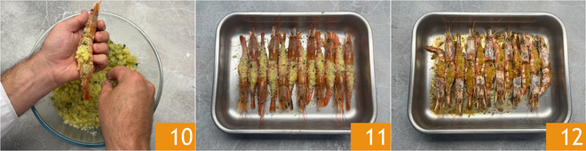 Füllen Sie die Riesengarnelen 10 und legen Sie sie mit der Panadenseite nach oben auf ein Backblech 11. Backen Sie bei 200°C für etwa 15 Minuten, bis sie vollständig goldbraun sind. Ihre gratinierten Riesengarnelen sind bereit zum Genießen 12.