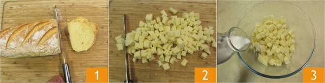Um die überbackenen Semmelknödel zuzubereiten, beginnen Sie damit, das alte Brot 1 zu schneiden, indem Sie die Kruste entfernen und es in Würfel 2 schneiden. Erwärmen Sie die Milch in der Mikrowelle oder in einem Topf. Gießen Sie sie über das Brot 3 und mischen Sie.