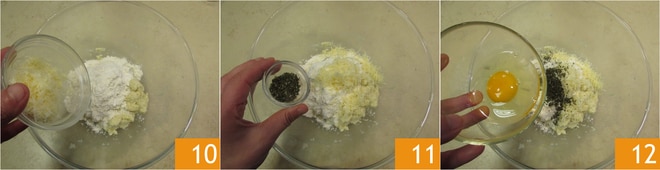 Würzen Sie mit 20 g geriebenem Bergkäse 10, dem Rosmarin 11, Salz, Pfeffer und dem Ei 12.