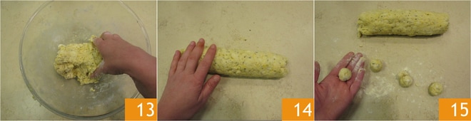 Kneten Sie erneut, um alles zu vermischen 13. Übertragen Sie den Teig auf die Arbeitsfläche und formen Sie eine Rolle 14. Nehmen Sie nun etwa 10 g Teig und formen Sie eine Kugel, indem Sie sich mit etwas Hartweizengrießmehl helfen 15.
