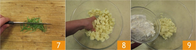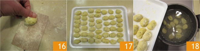 Rillen Sie die Kugeln mit einem Gnocchi-Brett 16 und legen Sie die Gnocchi auf ein mit Grieß bestreutes Tablett 17. Bringen Sie einen Topf mit reichlich gesalzenem Wasser zum Kochen und kochen Sie die Gnocchi 18.