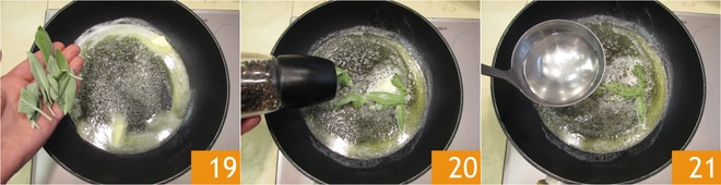 In der Zwischenzeit schmelzen Sie in einer großen Pfanne die Butter und würzen Sie mit Salbei 19, Pfeffer 20 und Salz. Verdünnen Sie den Boden mit etwas Kochwasser 21.