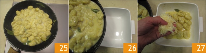 Mischen Sie, um zu emulgieren 25. Gießen Sie die Hälfte der Gnocchi in eine Auflaufform von 20x20 cm 26, bestreuen Sie die Oberfläche mit der Hälfte des restlichen Käses 27.