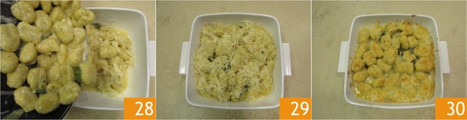 Fügen Sie die andere Hälfte der Gnocchi 28 und den Rest des verbliebenen Käses 29 hinzu. Grillen Sie im Ofen für etwa 5-6 Minuten, gerade lange genug, um den Käse zu schmelzen und zu gratinieren. Servieren Sie die heißen und geschmolzenen überbackenen Semmelknödel 30.