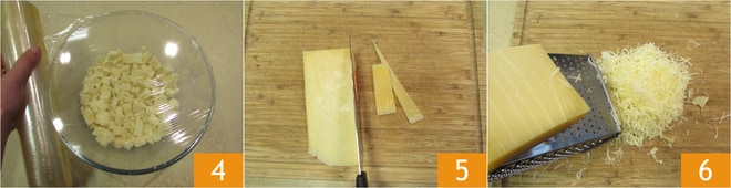 Decken Sie die Schüssel mit Frischhaltefolie ab und lassen Sie sie etwa eine Stunde ruhen 4. Entfernen Sie die Kruste vom Bergkäse 5 und reiben Sie ihn mit einer groben Reibe 6.